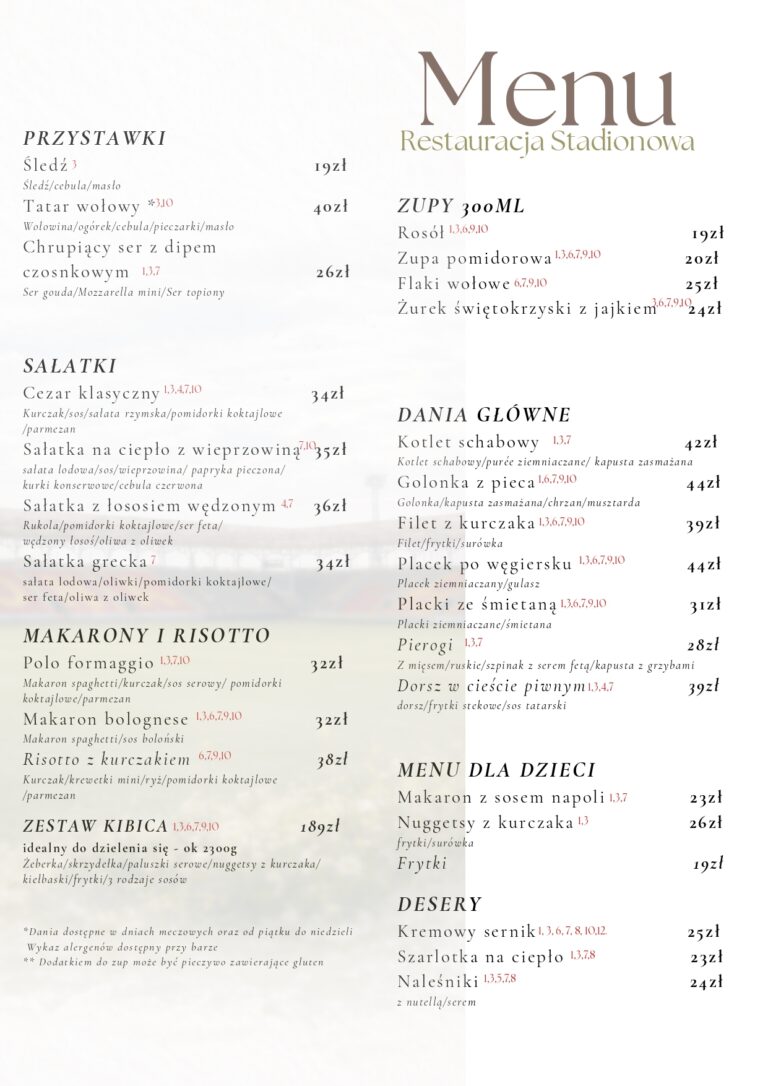 * w dni meczowe Restauracja czynna jest do późniejszych godzin